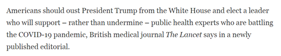 就在《柳叶刀》文章发布后不久,美国国家公共广播电台(NPR)刊登题为“一家顶尖的医学杂志敦促:换掉特朗普,支持疾控中心”的报道对该篇文章做了这样一番解读,认为《柳叶刀》社论其实是在说:美国人应该把特朗普从白宫赶出去,选出一位支持而不是削弱正在抗击新冠疫情的公共卫生专家的领导人。